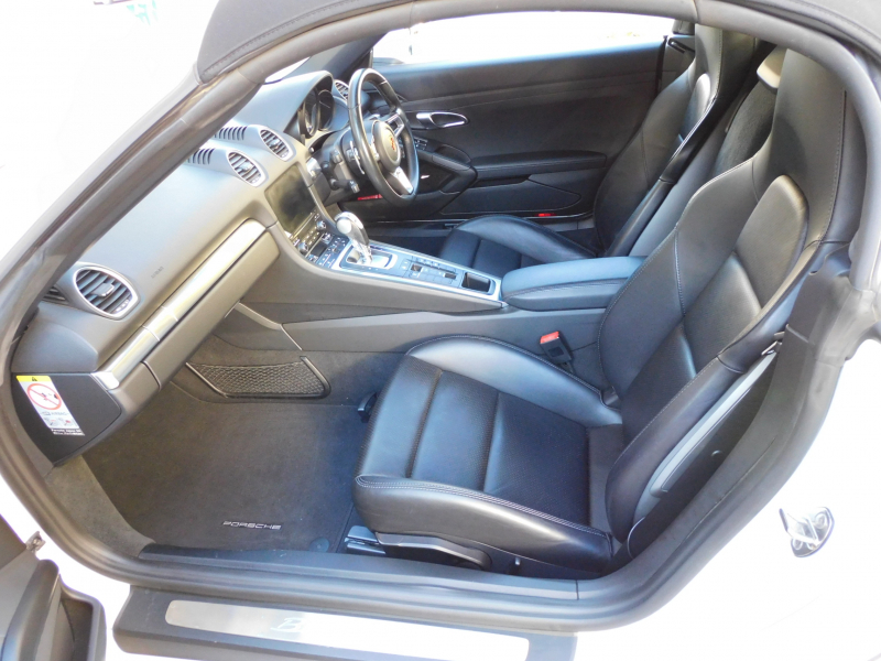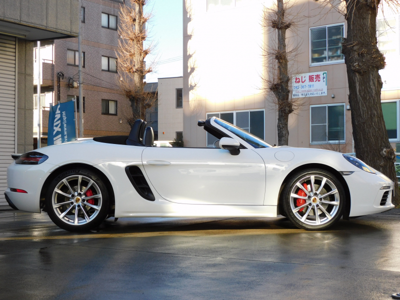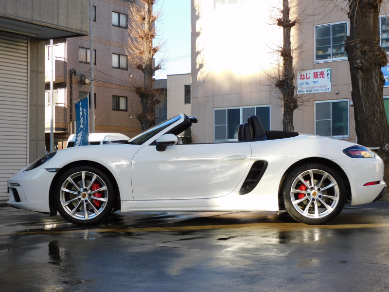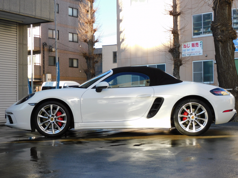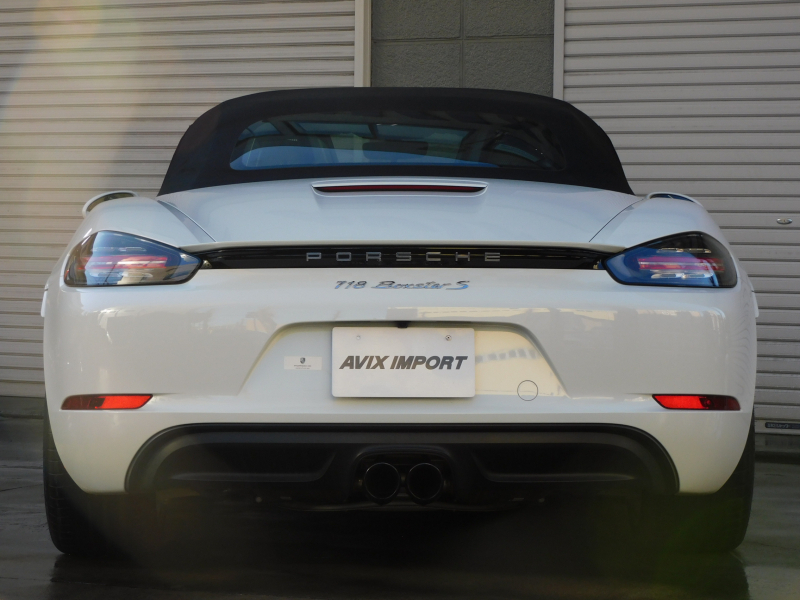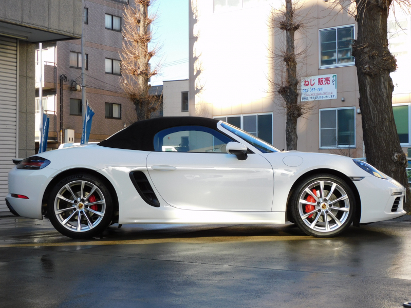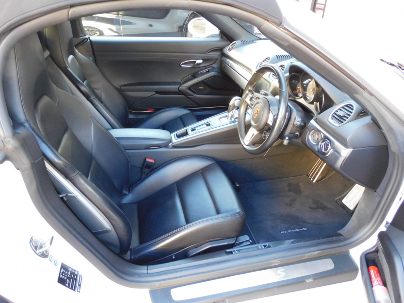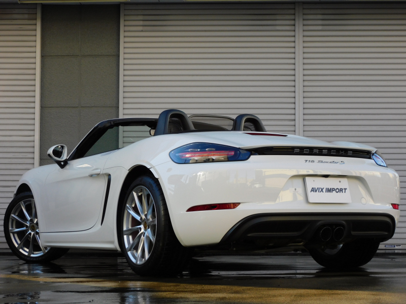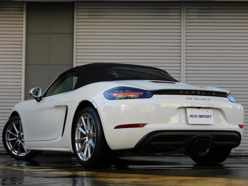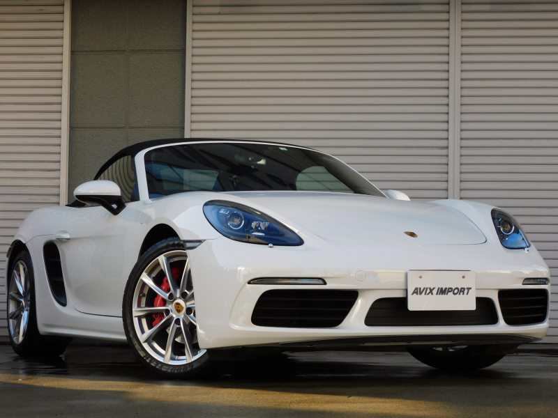 上級グレードS!! 運転しやすい右ハンドル、7速PDK搭載!! 安心の正規ディーラー車!! 取説・記録簿付 事故歴ありません!! 綺麗な外装色ホワイト&落ち着いたブラックカラーソフトトップの組み合わせに19インチボクスターSホイール&レッドペイントブレーキキャリパーが迫力あるエクステリアを演出!! 使用感の少ない心地よい禁煙の室内はブラックレザーシート&GTスポーツステアリングの組み合わせに快適なシートヒーター付!! 解像度7インチタッチスクリーンを採用したポルシェコミュニケーションマネジメントシステムにBOSEサウンドシステム搭載!! 便利な電動可倒式ドアミラー、運転操作をサポートするリアビューカメラやクルーズコントロール、夜間の運転をサポートするバイキセノンヘッドライト(PDLS付)装備!! ドライビングプレジャーを掻き立てるスポーツクロノパッケージ&スポーツエグゾーストに2.5L 水平対向4気筒ターボエンジンさらには911ターボ同様VTG(可変タービンジオメトリー)が相まってストレスのないドライビングをお愉しみいただけます!! 上級グレード718ボクスターSをお探しの方は是非お急ぎください!!