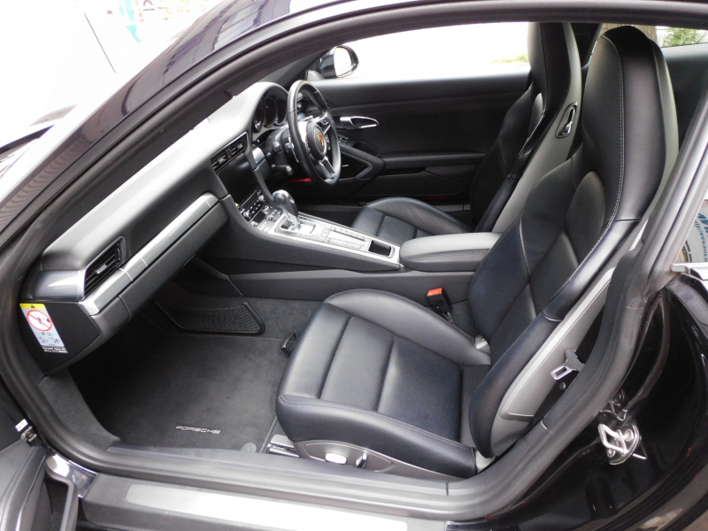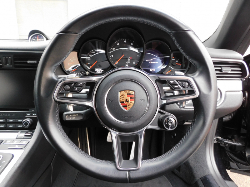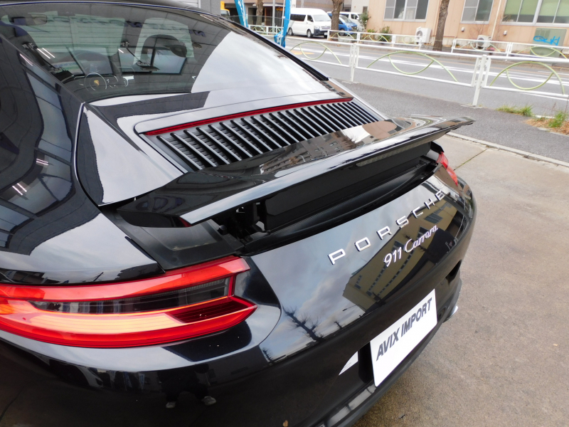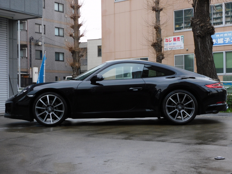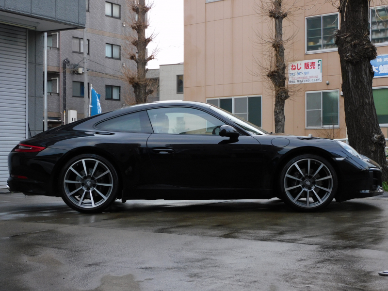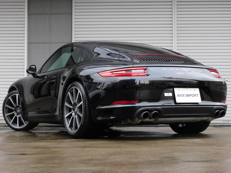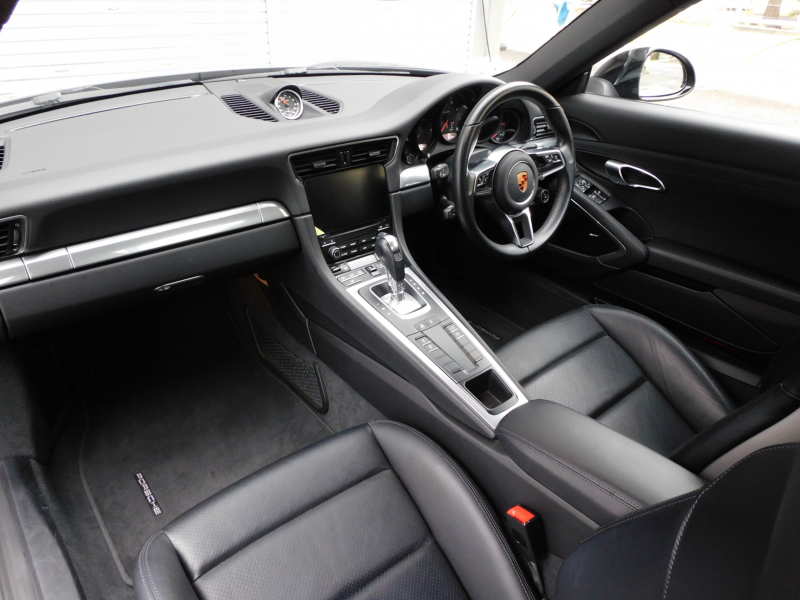 洗練された後期型!! 3L水平対向6気筒ツインターボエンジン搭載!! 安心の正規ディーラー車!! 運転しやすい右ハンドル&7速PDK搭載!! 取説・記録簿付 もちろん事故歴ありません!! 人気の外装色ブラック&スポーツデザインフロントエプロンに純正20インチカレラクラシックホイールやスポーツテールパイプ、ブラック仕上げLEDヘッドライト(PDLSプラス付)が装備され迫力有るエクステリアを演出!! 使用感はとても少なく心地良い禁煙の室内は高級感漂うアルカンターラルーフライニングに落ち着いたブラックレザーシート&快適なシートヒーター&ステアリングヒーターが完備!! 後期型より採用された高解像度7インチタッチスクリーンを採用したPCMナビ(ポルシェコミュニケーションマネジメントシステム)にBOSEサウンドや運転操作をサポートするリアビューカメラ、クルーズコントロールも装備!! ドライビングプレジャーを搔き立てるスポーツクロノパッケージに出力370ps(カタログ値)を発生する水平対向6気筒ツインターボエンジンとPASMが相まって卓越したパフォーマンスをご堪能できます!! 後期型911カレラをお探しの方は是非お急ぎ下さい!!