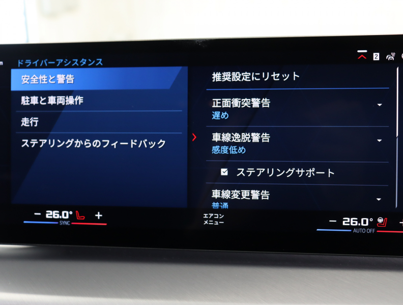 ●ドライビング・アシスト・プロフェッショナル: ー 高速道路渋滞時ハンズ・オフ・アシス ー ACC/アクティブ・クルーズ・コントロール(ストップ&ゴー機能付) ー ステアリング&レーン・コントロール・アシスト ー レーン・ディパーチャー・ウォーニング(車線逸脱警告システム)ー レーン・キーピング・アシスト (アクティブ・サイド・コリジョン・プロテクション付) ー レーン・チェンジ・ウォーニング ー 衝突回避・被害軽減ブレーキ(事故回避アシスト付) ー 前車接近警告機能 ー 後車衝突警告機能 ー クロス・トラフィック・ウォーニング(フロント&リヤ) ー クロスロード・ウォーニング ートラフィック・サイン・アシスト(速度制限認識) ー エマージェンシー・ストップ・アシスト●DSC/ダイナミック・スタビリティ・コントロール(拡張機能付 )●ABS/アンチロック・ブレーキング・システム●アクティブ・プロテクション●パーキング・アシスト:ー パーキング・アシスト(並列/縦列) ー アクティブPDC/パーク・ディスタンス・コントロール ーリヤ・ビュー・カメラ(予想進路表示機能付) ーリバース・アシスト/後退時ステアリング・アシスト機能●BMWヘッドアップ・ディスプレイ●自動防眩ドア・ミラー/ルーム・ミラー●誤発進抑制制御●ダイナミック・ブレーキ・ライト(ブレーキ・ライト点滅機能)●全席3点式シートベルト●BMWデジタル・キー●BMW SOSコール●BMWリモート・サービス●タイヤ空気圧警告システム●タイヤ空気圧モニタリング・システム●タイヤ・リペア・キット●エアバッグ(フロント、サイド、カーテン・ヘッド〔フロント&リヤ〕)●アラーム・システム(My BMWアプリ通知機能付)
