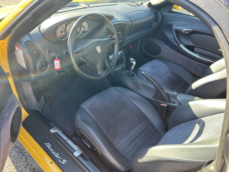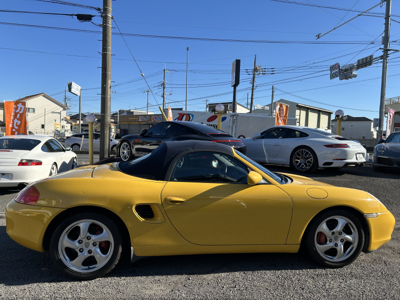 距離の少ない希少なイエロー、ボクスターS入庫しました。左ハンドル、6速マニュアルです。