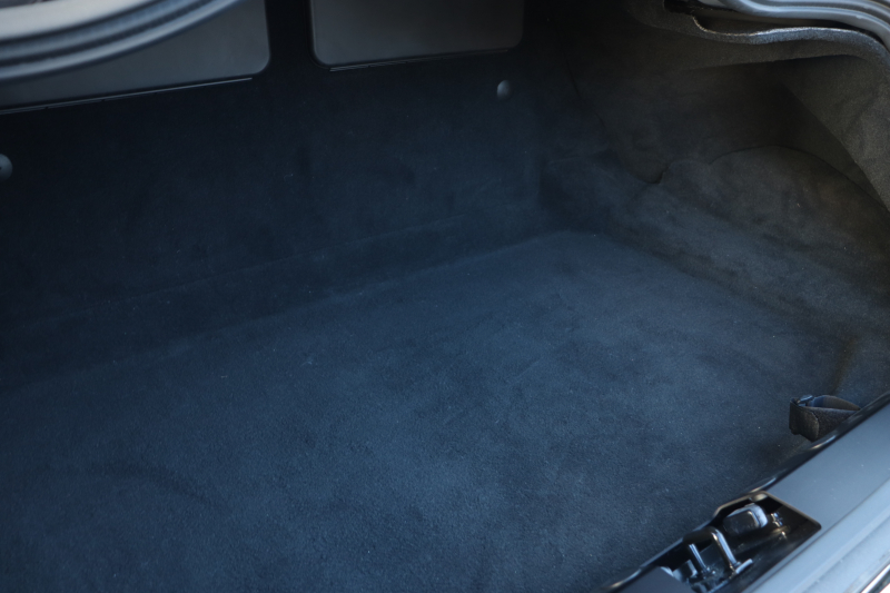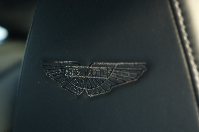 内装はピュアブラックレザーで統一された落ち着きある空間。年式を踏まえても良好な状態が保たれており、刺繍入りヘッドレストのアストンマーティンウィングスが、この車の背景と品格を静かに物語ります。