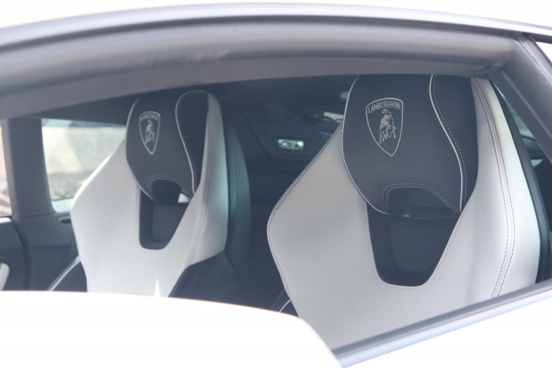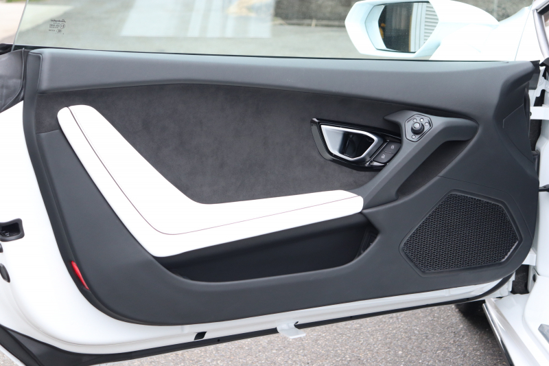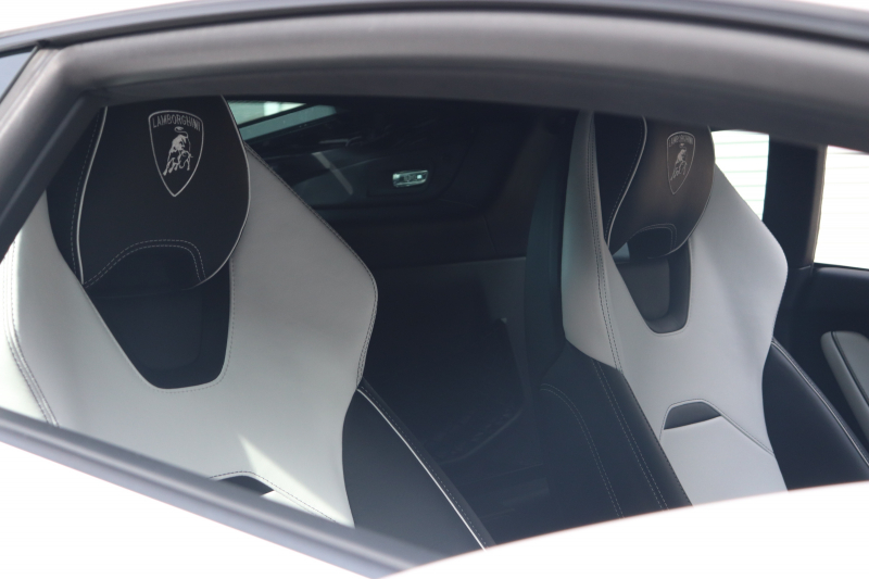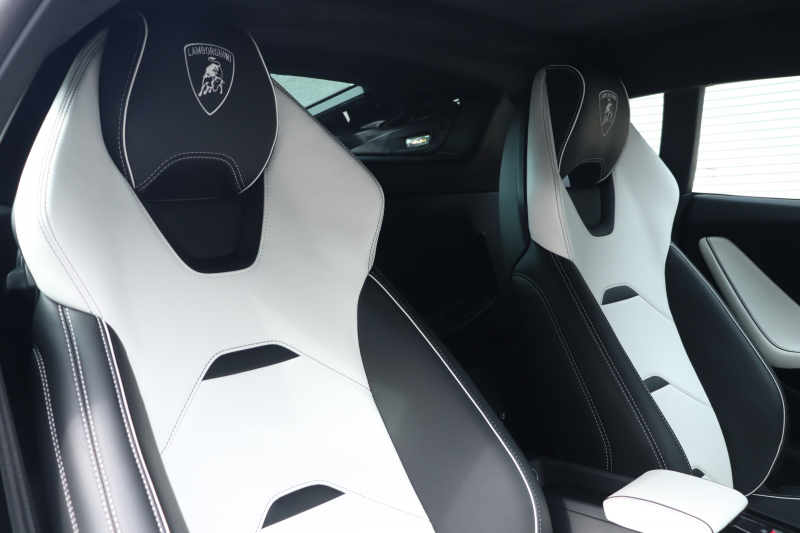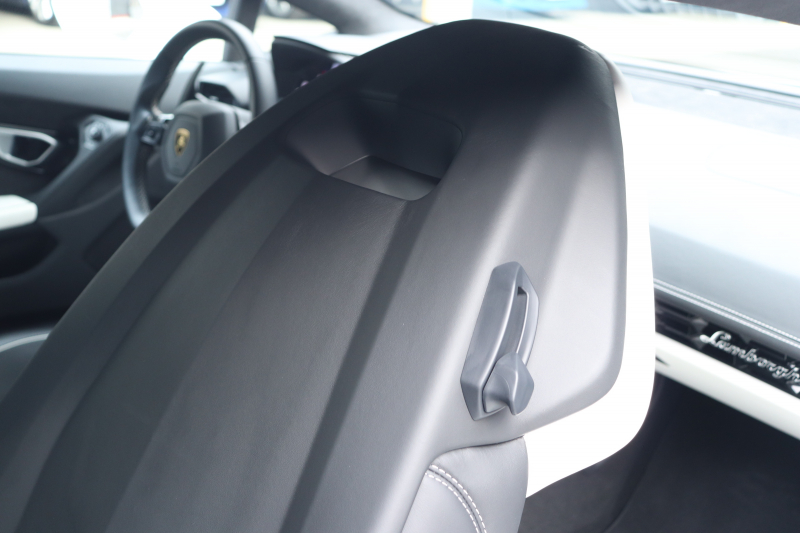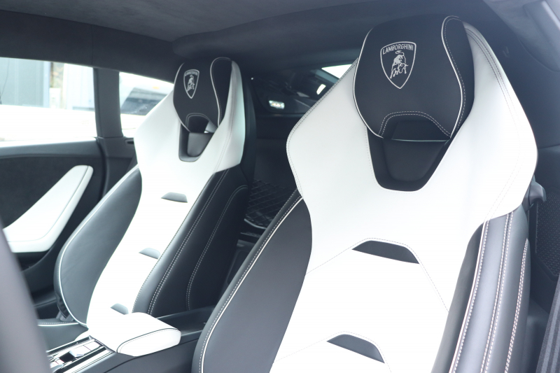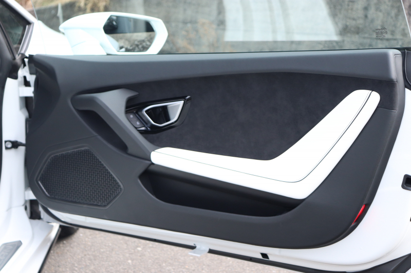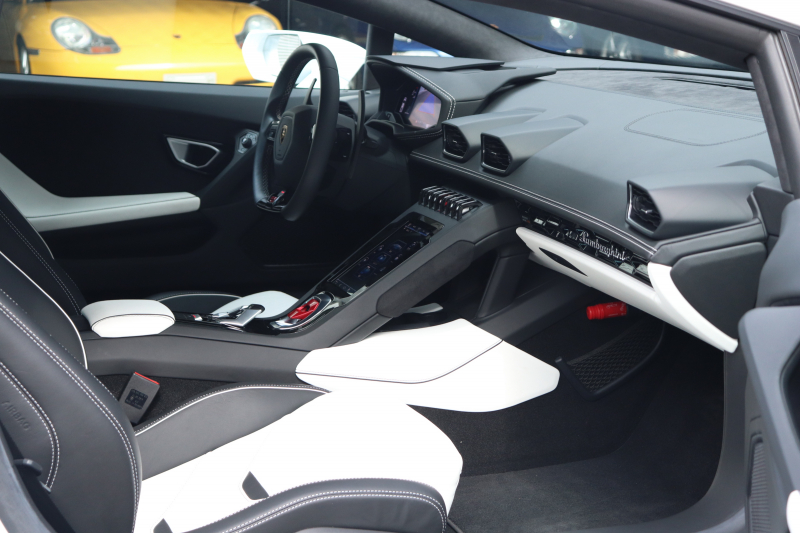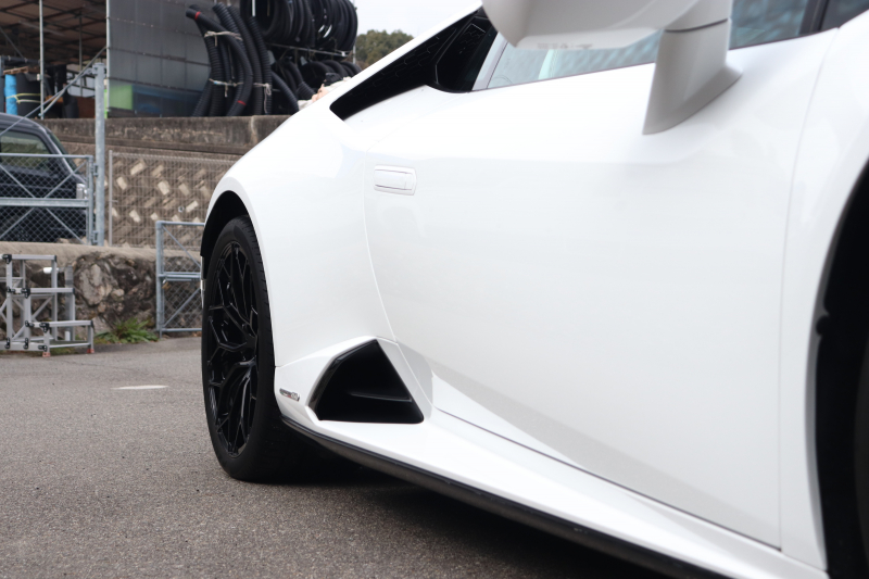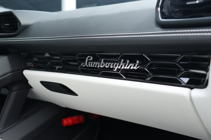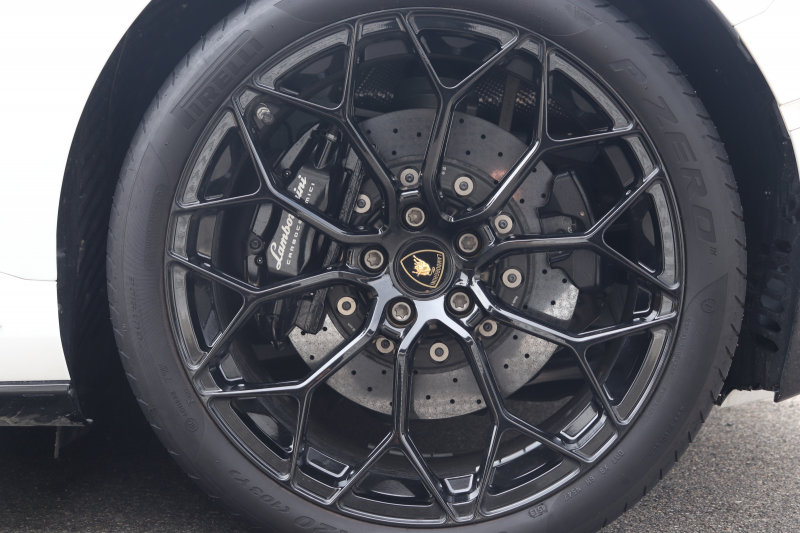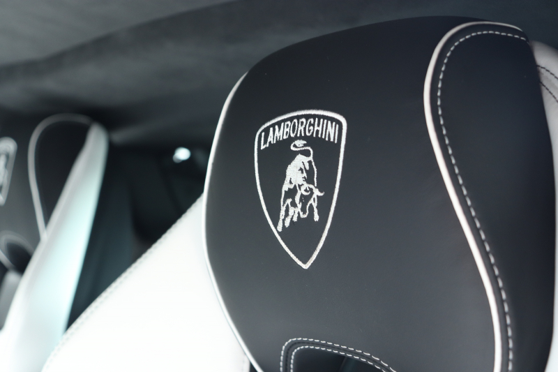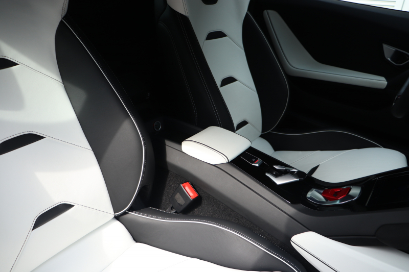 外装はビアンコモノセルス。純白のボディがウラカン特有の鋭いプレスラインを明確に浮かび上がらせます。そこにフロントスポイラー、サイドスカート、サイドダクト、リアバンパー、リアスポイラー下部のグロスブラックを組み合わせることで、輪郭が強調された立体的な印象を形成。20インチ艶ありブラックホイールとブラックキャリパーが足元を引き締め、ボディとのコントラストを完成させています。