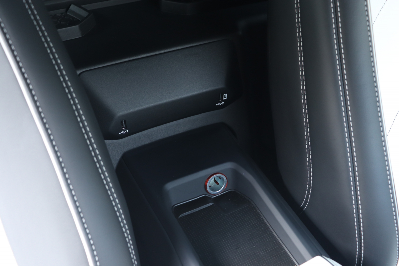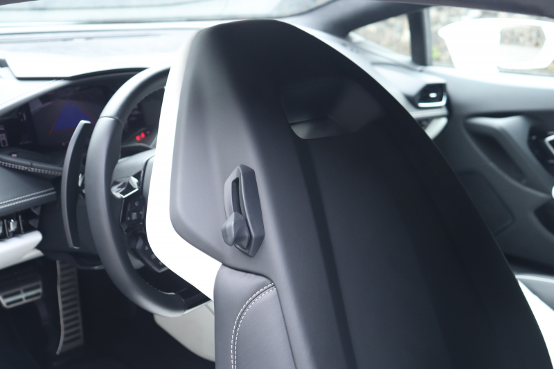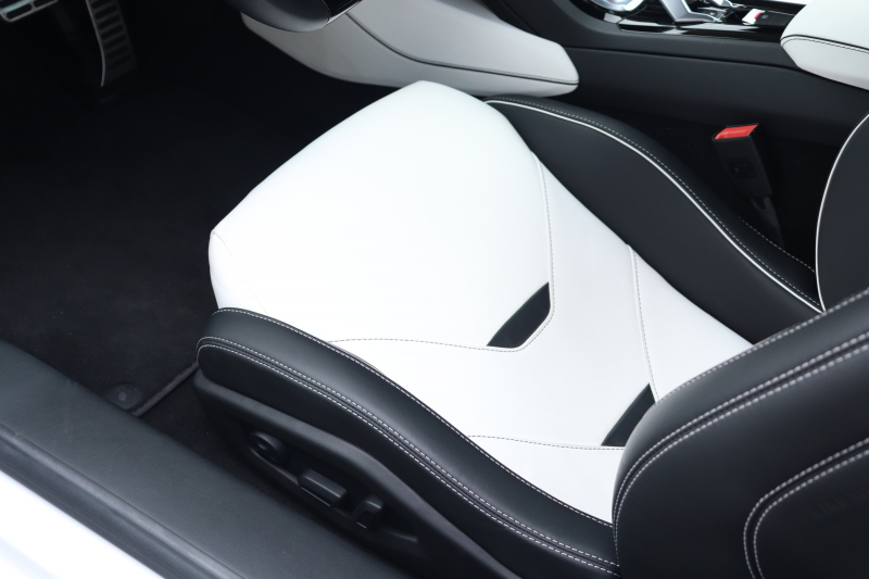 内装もホワイト/ブラックのバイカラーで統一。スポルティーボアルカンターラEVOトリム、アルカンターラルーフ、ホワイトステッチが外装との連続性を持たせています。ヘッドレスト刺繍やダッシュボードロゴ、カーテシランプの演出に至るまで、色味の方向性は一貫。夜間にはアンビエントライトがブラック基調の空間に陰影を与え、モノトーンの世界観をさらに際立たせます。